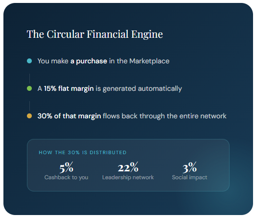 Every purchase activates our financial engine automatically — cashback for you, income for leaders, and social impact. No extra steps needed